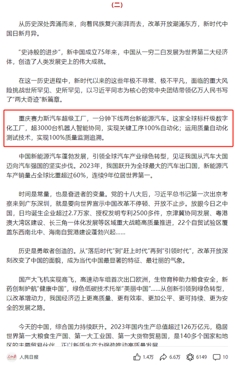人民日报发表重要评论,再提重庆赛力斯 / 赛力斯汽车再登央视
