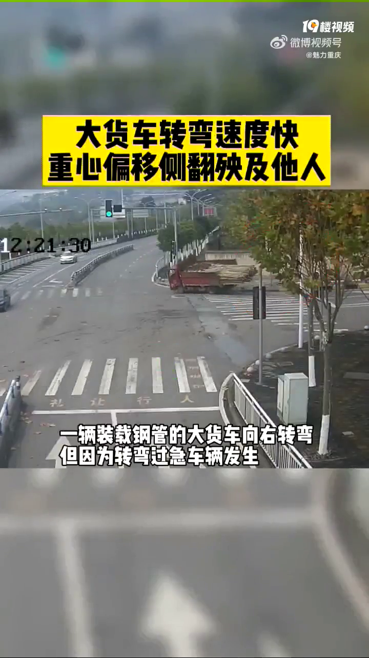 一辆装载钢管的大货车向右转弯,但因为转弯过急,车辆发生了侧翻