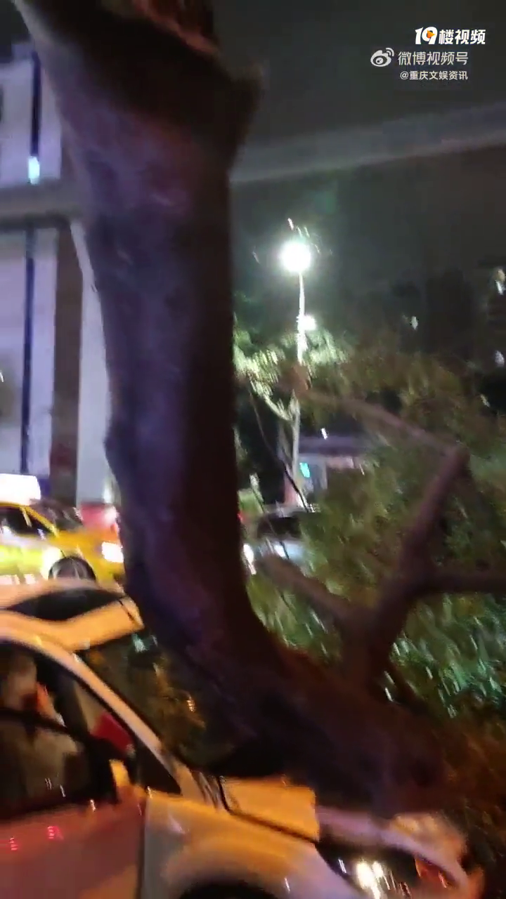 昨晚重庆九龙坡毛线沟转盘,行道树断裂导致一辆私家车被树干压倒