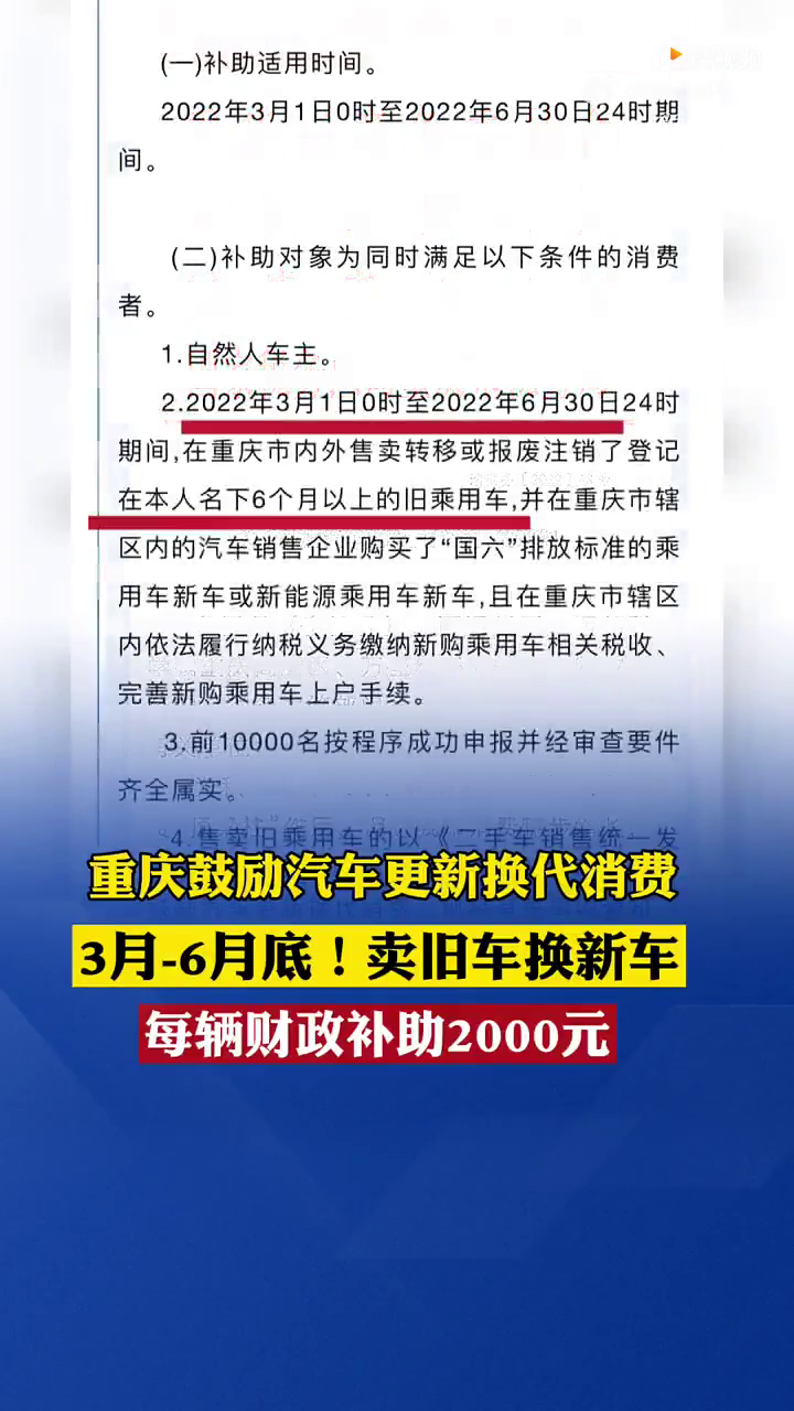 重庆鼓励汽车更新换代消费,3-6月底,卖旧车换新车。