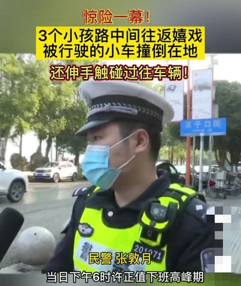 1月5日,重庆合川三个小孩在公路上追逐、打闹,站在路中央“指挥交通”,看到减速避让他们的车辆,甚至跑上去摸一下车身,结果一小孩横穿公路时与一小车发生碰撞。幸好被撞孩子经医生检查无大碍,民警随即对三个孩子及其监护人进行了批评教育