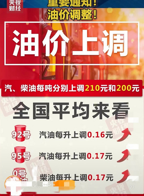 (2月17日)24时开启。本次油价调整具体情况如下:国内汽、柴油价格每吨分别提高210元和200元。全国平均来看,92号汽油、95号汽油和0号柴油每升分别上涨0.16元、0.17元和 0.17元。央视财经记者给您算了一笔账,按一般家用汽车油箱50L容量估测,加满一箱92号汽油,将多花8元。