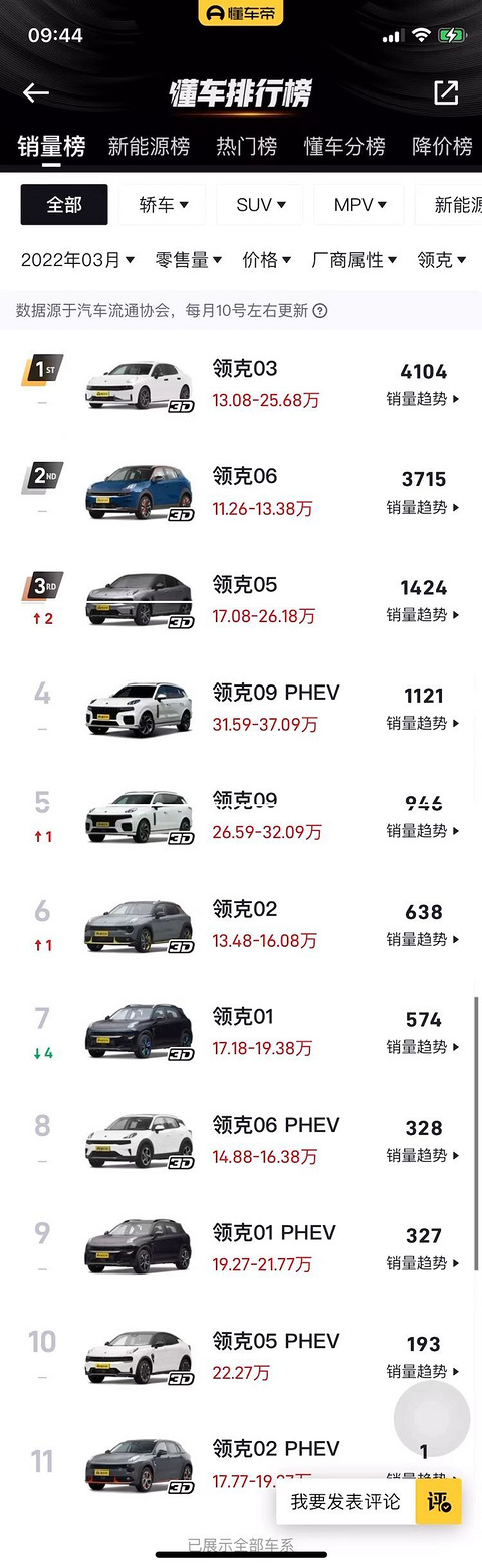 朋友想买领克01,想起这款车顶着沃尔沃XC40平替的身份,想着产品力挺好的,但一看销量,3月才买574台,这都不能叫边缘化,而是完全被市场遗忘了! 一看整个领克,都不怎么样。整个品牌最便宜的两款车型销量最高,领克03和领克06在3月销量分别带到4千1和3千7,其他都处于被人遗忘的状态。 领克整个品牌全部车型加起来月销量才1.3万辆,想起此前晚上热议沃尔沃全系销量不及理想一款车,现在“ 平替”领克还