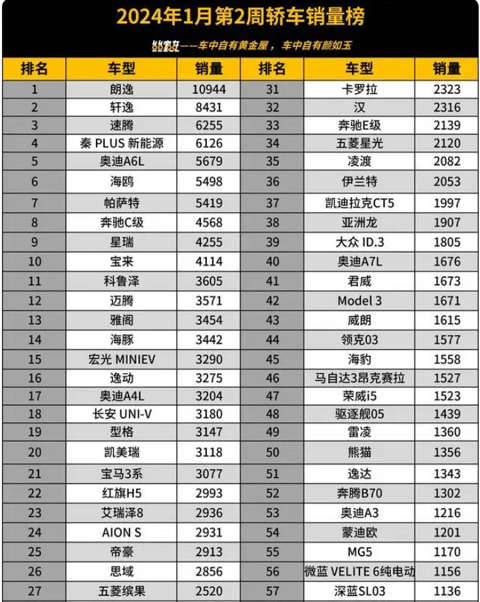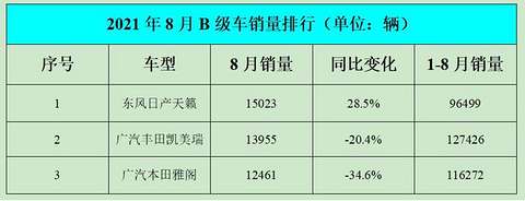 B级轿车 销量前五位 1 2 3 全部被日系占据