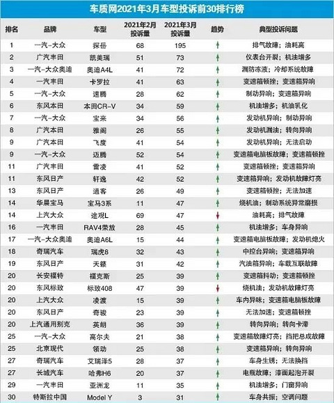 说国产车质量差的被啪啪打脸!3月份车型投诉排行榜前30出来了
