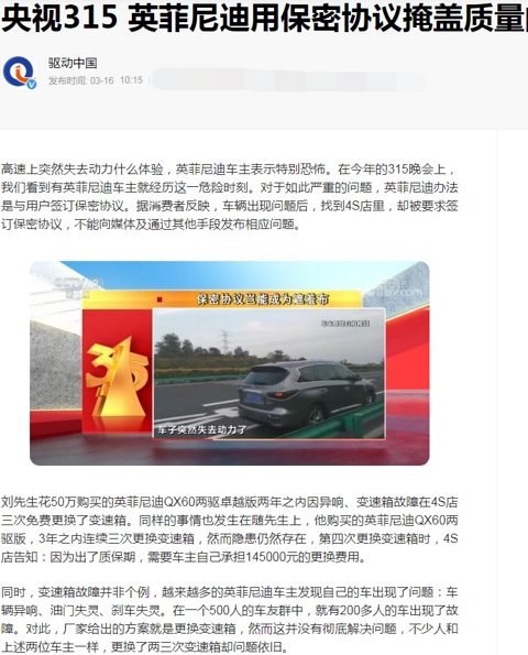 如题,日产CVT变速箱车型的车主(貌似国内日产基本全是CVT车型,奇骏,轩逸,逍客和天籁等等。)多注意自己的变速箱,尤其是3-5年的老车主,里程6-8万公里的,看看变速箱有无打滑或者动力丢失的情况,如果发现了尽早去4S处理。目前故障爆发率有点高。平时开车时尽量温柔踩油门,避免大脚猛踩急加速。今年315晚会英菲尼迪CVT事件已经被曝光, 而英菲尼迪在中国的销量非常少,最近几年在中国的销量总共才十几万