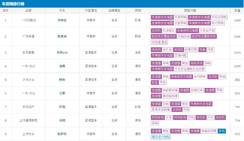 2020年年度投诉排行榜 TOP 10 第1名,一汽马自达,阿特兹,数量:1488 第2名,广汽丰田,凯美瑞,数量:1241 第3名,东风标致,408,数量:1039 第4名,一汽大众,速腾,数量:1035 第5名,上汽大众,朗逸,数量:882 第6名,一汽大众,迈腾,数量:825 第7名,东风日产,轩逸,数量:790 第8名,上汽通用别克,英朗,数量:714 第9名,上汽大众,帕萨特,数量:62