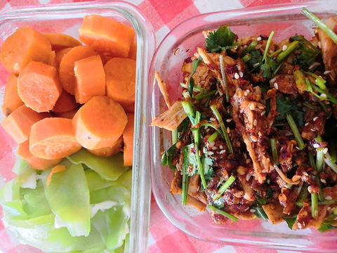 凉拌鸡胸肉+蒸红薯+清炒莴笋