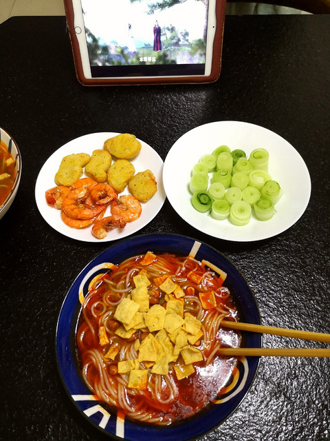 晚餐!螺蛳粉,烤虾,烤鸡块