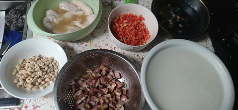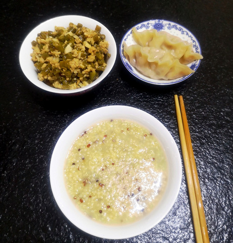 炸酱面、腊肉四季豆土豆饭、阴米南瓜粥