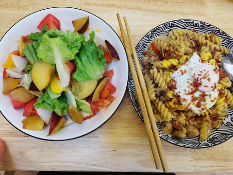 先看成品 这是在上海的第一餐蔬果沙拉 培根奶油螺旋意面