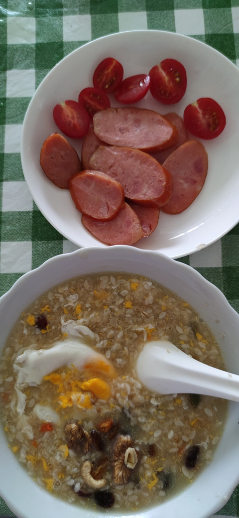 南瓜薏仁粥~煎鸡蛋~腊汁肉夹馍~凉拌藤菜~jiao头