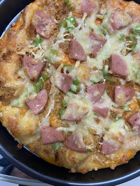 从抖音上断断续续学了三个月,这是最近做得还算成功的披萨,肉松蛋糕卷,手撕面包