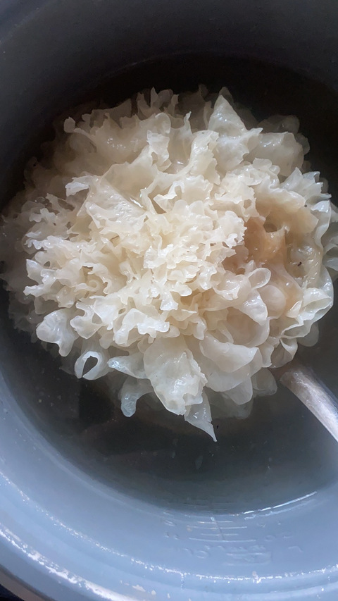 温水泡银耳一个小时左右银耳撕成小块入锅加入枸杞和红枣加入大块冰糖高压锅煮一个小时