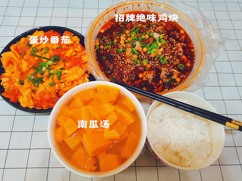 今日晚餐,蛋炒番茄失败,手抖盐放多了好咸+打包招牌绝味鸡块+南瓜汤。我的厨艺经常翻车!哈哈哈哈哈哈哈哈!