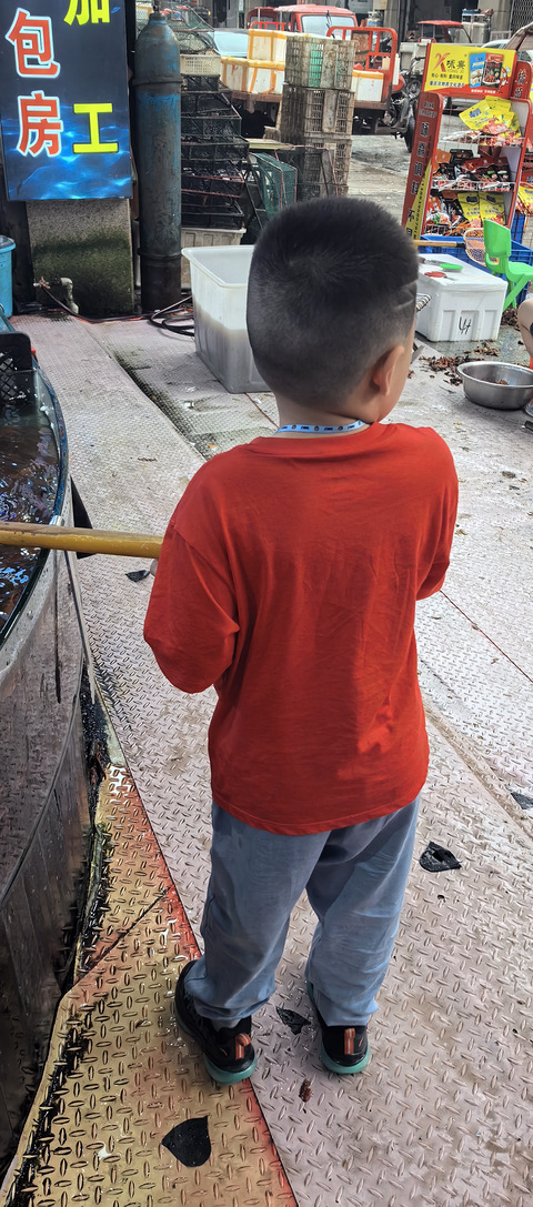 端午节,本来打算去碧津公园转转的,走到公园附近了,天公不作美,小雨淅淅沥沥的下个不停。公园之行只能作罢。 想着这边离三亚湾水产市场不远了,儿子一直念叨着吃海鲜,就改到三亚湾转转了。这边没有地下停车场,车都是停在路边或者市场里。队友有点儿洁癖,他说市场里面停车,有点儿脏。这边小龙虾15元一斤,之前在我们家附近买的是25一斤。儿子拿着网子在海鲜档玩了挺久。生蚝最便宜的是3元一个,买了点儿,卖家包开,清