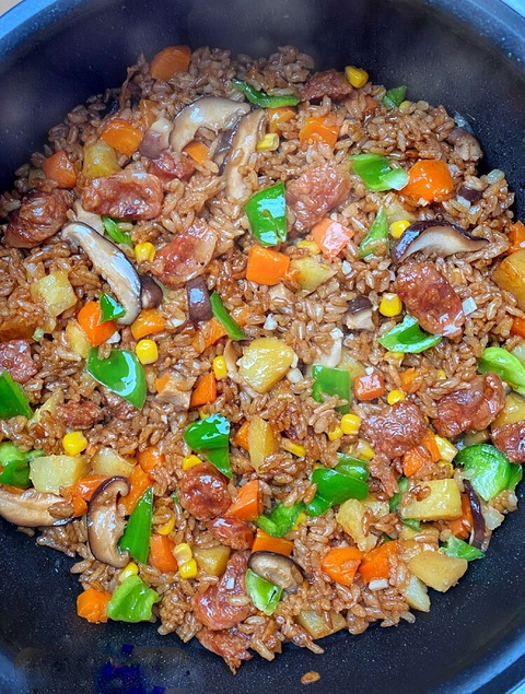 谁要求这样做的给我,站出来这么好吃的估计你能干个三碗满屋飘香的饭,你没有想到吧食材1.大米,腊肠,土豆,香菇,胡萝卜,青椒,蒜末2.酱汁:2勺生抽 ,1勺蚝油,1勺老抽,半勺白糖,少许胡椒粉,盐,1勺植物油做法1.先将大米洗掏干净放入电饭锅内,倒入酱汁搅拌均匀即可,依次放上所有配菜,(除了青椒和蒜末)2.电饭锅选择常规的模式煮熟后,开盖加入青椒,蒜末,淋一点香油,搅拌搅拌开吃啦3.焖饭想要好吃,选