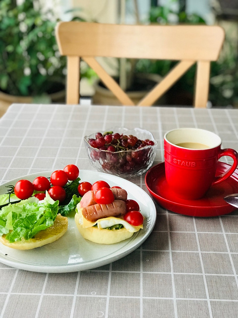 今天吃熔岩面包和牛奶苹果,很喜欢这种软软的奶香味十足的面包牛肉饼吃完了,那就烤肠芝士汉堡,饮料喝咖啡,水果吃小蕃茄和玻璃脆。山姆的串串蕃茄很好吃,做牛排的配菜相当OK!