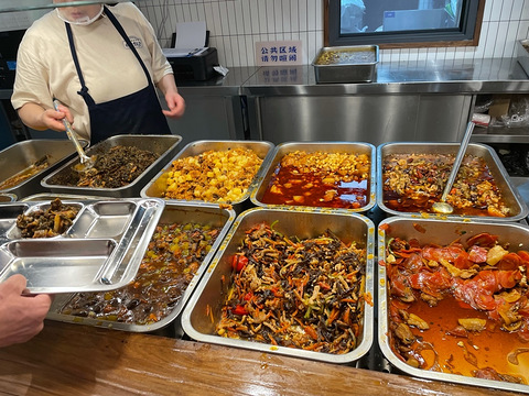 18一份,可以在在某评软件上购买 ,肉菜是工作人员打,素菜水果自己打先买单给你一个餐盘一个碗吃多少盛多少,本着不浪费的原则吃饱味道很家常,没有重油盐,没有过多作料,老年人这些完全适合就是中午饭点人很多 排队很长 但打工人们都还是吃得很快 位置更新得快
