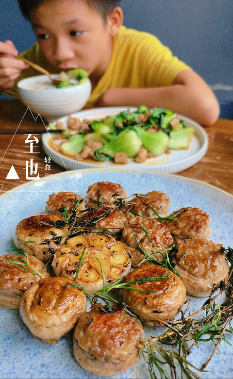 鲜肉或虾,拌好喜爱的调味儿料……装入去脚洗净的口蘑里,轻轻压实。少许油热锅,大蒜与新鲜迷迭香叶一起放入煎锅,同时将口蘑正反面煎至产生美拉德反应即可。