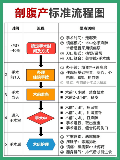 根据自己的经验,总结了一份剖腹产标准流程图,不同地区不同医院可能会有小差别,不过整体就是这些啦,准备剖腹产的姐妹可以重点看看 . 本篇重点内容 剖腹产全流程图 剖腹产术前准备 剖腹产手术当天事项 剖腹产住院1-5天怎么做