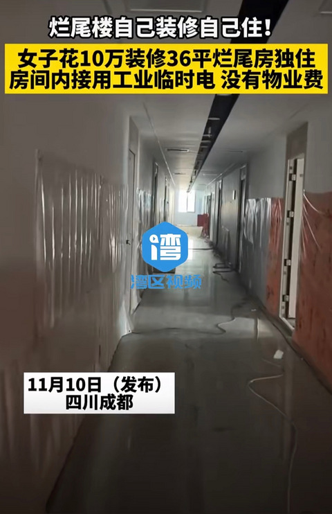 11月10日,四川成都。女子花10万装修36平烂尾房独住,整个小区只有她一人入住,到了晚上就一片漆黑。当事人称,房子只通了水,没有电也没有天然气,没有竣工验收和消防验收。自己家有电是因为接了工地上的临时电线,可以满足基本的生活需求,虽然房子烂尾了,但生活是自己的,期待能有验收交房的那一天。对此,你怎么看?