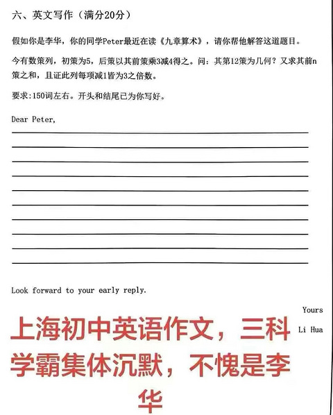 昨天,一道「上海初三英语作文」题让家长群炸锅了,这道「让语文数学英文三科学霸都沉默」的英文作文题,长这样——假如你是李华,你的同学Peter最近在读九章算术,请你帮他解答这道题目。今有数策列,初策为5,后策以其前策乘3减4得之。问:其第12策为几何?又求其前n策之和,且证此列每项减1皆为3之倍数。要求:150词左右。开头和结尾已为你写好。Dear Peter,()Look forward to y