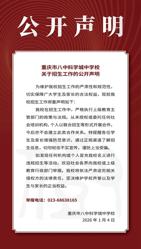 重庆市八中科学城中学校关于招生工作的公开声明