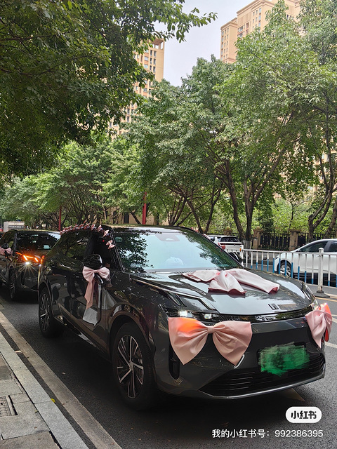 出国庆自用纯手工婚车装饰 1、材质为缎面,里面加了硬网格,质感非常好,颜色粉色,已经缝好吸盘很牢固(实物实拍未滤镜未P图)2、尺寸和数量:最大的是85cm(1个,前盖上的),65cm(2个,最前面的两个眼睛),26cm(2个,后视镜上,带绑带58cm),10cm(20个)3、我们是领克08灰色加黑顶(仅供参考)#婚车#婚车装饰#婚车布置#婚礼婚车#重庆#蝴蝶结#领克08
