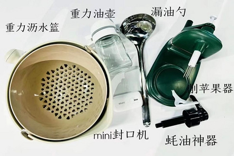 下单了6种神器(从左到右依次):①重力沥水篮、重力油壶、迷你封口机、漏油勺、苹果削皮机、蚝油神器。今天我倒要看看这些神器到底有多神。