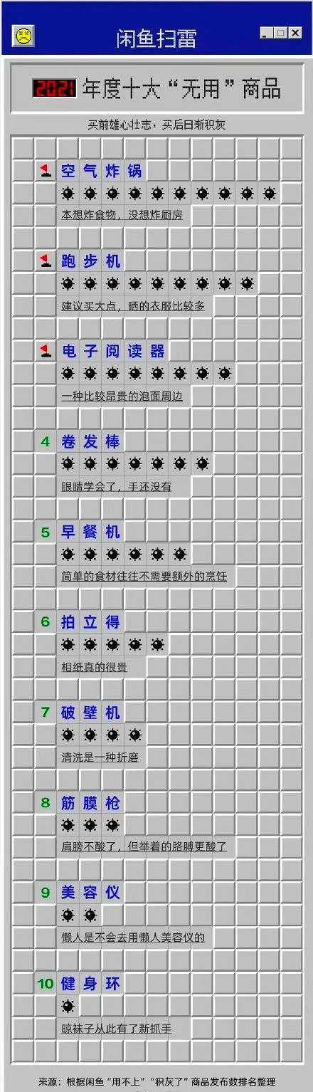 前段时间,闲鱼发布了闲置率 Top 10 的家电。 研究所本来以为上榜的会是跑步机、豆浆机、破壁机这些闲置常客。但一看榜单,惊掉我们下巴。第一名居然是「空气炸锅」。