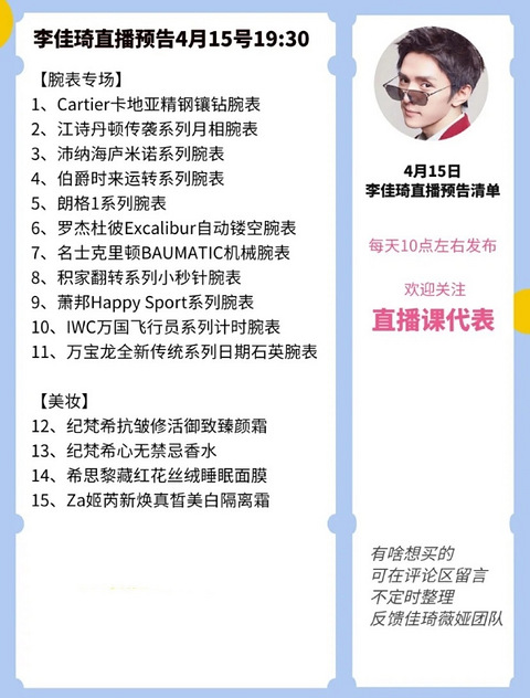 为大家带来了李佳琦4.15直播预告,商品清单来咯