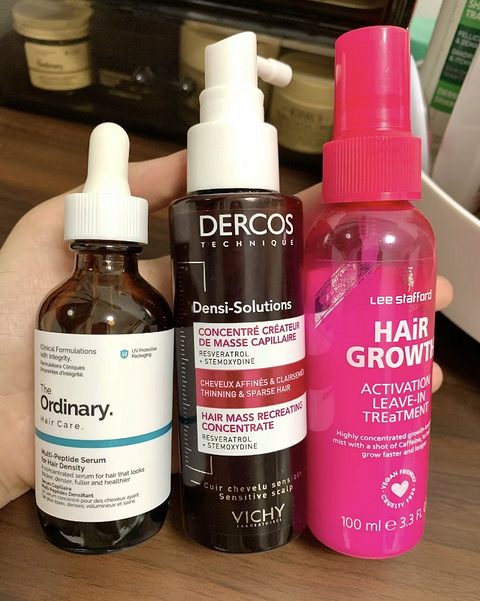 长头发了!!!左边the ordinary涂发缝,有小炸毛,适合掉发多的 中间薇姿涂头皮,适合断发多的脆皮发质,会加固发根 右边英国的Lee Stafford涂发际线会有一层小绒毛,有氛围感那味,我还蛮喜欢的 洗完头吹到半干的时候涂头皮上按摩一会,最后再吹干就行啦
