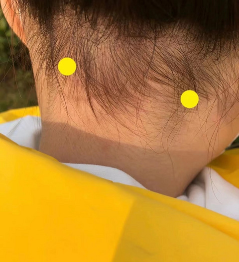 这个叫风池穴,没错!就是眼保操会按到的穴位!两条大筋靠外一点,和耳垂齐平的地方我按的时候感觉整个头都轻飘飘的哈哈哈!爱熬夜的姐妹,或者睡不着的时候多按按!我掉发有点严重加上我发际线有点高,还和妈妈一起在用育发液和梳头。我觉得掉发不严重的可以省略这步,平时早睡锻炼身体别给自己太大压力就可以啦