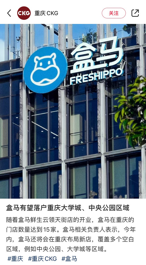 盒马有望落户重庆大学城、中央公园区域!
