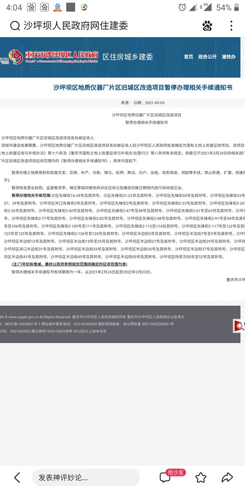 一个产权冻结,一个区住建委也官宣在今年征收计划中。 其实我在2020年一月刚好中地装来重庆给两个厂开督导会(当时只是暂时提的探矿厂),刚好看到探矿厂一个(地质装备公司)新开一个和它做的行业八竿子打不着的子公司(房开发公司)毕竟央企国企开子公司不像私企那样。不可能随便上级母公司会批准它开。它们两个家厂的母公司也是奇怪以前和保利和通用地产签合同从来不督导自从闹摆。厂区搬一个,开始催一个。再到五月就开始