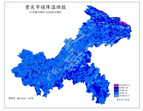 11月28日20时―12月1日20时全市平均气温降温预报图。重庆市气象台供图 华龙网讯(记者 梁浩楠)11月28日,重庆市气象台预计,11月29日白天到12月1日白天,重庆有一次降温降雨天气过程,大部地区日平均气温将下降4~7℃,11月30日到12月1日海拔1200米以上地区有雨夹雪或小雪到中雪;冷空气影响时,山口河谷地区有4~6级阵风。