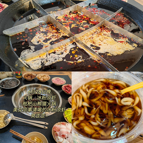 先来发个6月最后两天的吧[/11笑哭]6月最后一个工作日特别想吃藠头…搜索了一下附近发现七星岗的纯阳酒馆可能有,但是到了发现还要排队,最后去吃了美女同事推荐的熊猫火锅~就在枇杷山门口,娘娘们很热情点的每样菜都很好吃强烈推荐耙芋儿,另外豆干是那种有点烟熏口味的厚豆干,队友不是很喜欢,他喜欢吃那种泡泡豆干,但我个人觉得都可以 当然咯~还有同事请我喝的一碗冰粉凉虾,爽歪歪~