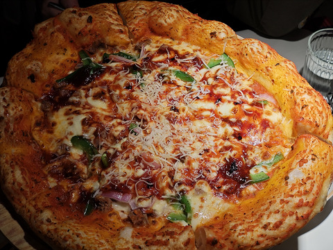 网上刷到好几次这个店了,身边的朋友都给了好评 场子有点小,布局比较紧凑,但是生意很好,都得排队 装修欧美风挺喜欢的|美式烟熏牛肉披萨^朋友不吃生肉所以点了个这个披萨,酱汁味道不喜欢,后悔没点招牌的水牛那个火腿披萨,有点遗憾|和牛牛油炒意面^类似于韭菜叶的意面。调味还行,默认的辣味,只是都是细丝真的很想找服务员要一双筷子|蒜香黄油煎蘑菇^浓郁蒜香味还可以|辣咖喱青口贝^标准泰式咖喱味,没有香茅的那种