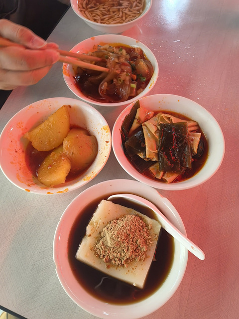 徒步完张飞古道后,坐摆渡船过澄江口码头上来饥肠辘辘随便找的餐馆,一吃惊为天人(也有饥饿感加成)老板的菜单只有六道菜,其他时令菜直接问能不能炒,有啥吃啥; 他家的泡菜味道一绝,家常鲤鱼泡椒混合青花椒的香气,鱼肉嫩滑汤底没有很浓的鸡精味,吃完不口干,鱼香肉丝糖醋味和辣味也是融合的刚刚好,只加了葱白,正宗老川菜做法,油卤的五香豆干,外层油炸的虎皮锁住了里面像嫩豆腐一样的汁水,卤香风味十足。最后来一碟老板