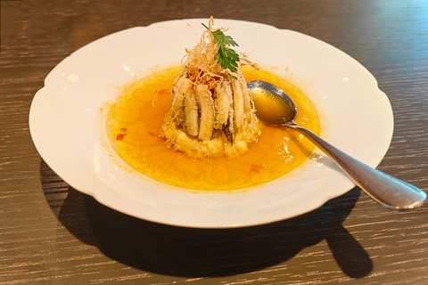 去年冬天去苏州,很大的原因就是为了吃传说中的蜜蟹拥剑。 宋代沈括《梦溪笔谈》中有这样一段文字——“大业中,吴郡贡蜜蟹二千头,蜜拥剑四瓮。”记载了吴郡向隋炀帝贡蟹的故事。早在一千多年前热爱吃蟹的隋炀帝就盛赞吴郡“蜜蟹拥剑”为“东南佳肴”。偶然在小红书刷到苏州凯悦酒店华池88中餐厅复刻出了这道超有名的苏帮菜,提前一个月定的位置。 当时我去的时候华池88还是苏州唯一的黑珍珠二钻苏帮菜,现在降为一钻了