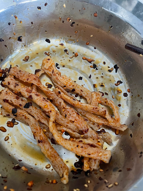 淘宝买的牛筋面,热水泡2分钟或者直接洗一下即可沥干一点,刷油,色拉油,玉米油,花生油,都可以主要是为了不粘水开了上锅蒸2-3分钟捞出来,放凉,我直接就拌上买的辣椒就行了辣度随意吃起来,很劲道