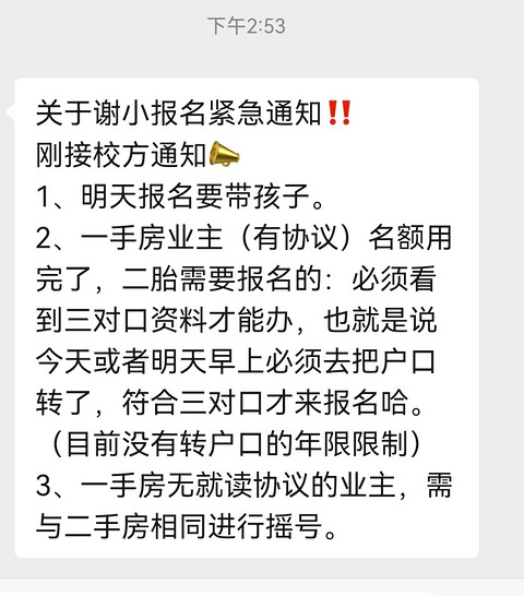 快点!突击转户口吧今年谢家湾学校招生通知出来,对于业主生的入学条件有了放宽。就以校方通知来划个重点一手房有协议的业主子女,二胎要入读谢家湾学校,只要符合三对口就可以。而且,对于落户时间没有限制,只要在6月7日报名时交得出来就行。 但是,没有协议的业主,还是只能和二手房一起摇号 6月7日(星期五)资料提交 9:30-16:00 学生在父母或法定监护人陪同下到校进行资料提交。携带资料:购房合同、入学协