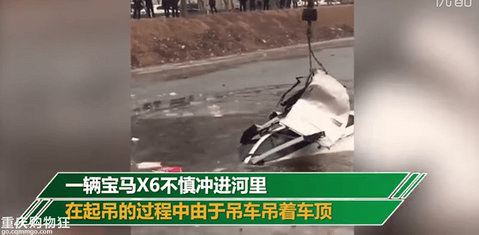 近日,河南滑县一辆宝马X6不慎冲进河里,在起吊的过程中由于吊车吊着车顶,且重力过大,车顶被撕开,随后换了起吊位置到轮胎处将车吊出,事故原因调查中。