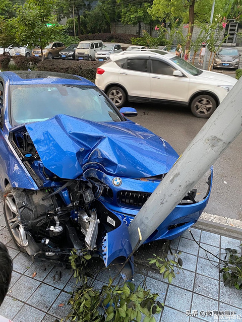 重庆巴滨路一宝马司机侧撞路灯,车头基本报废