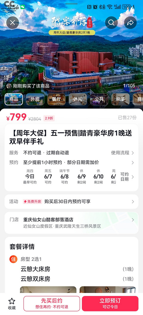 转让仙女山端午节酷客部落6.9晚入住标间一间