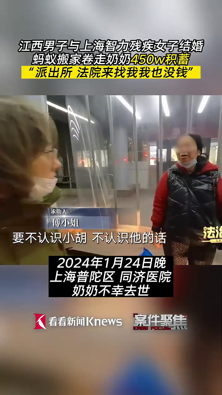 【#男子与智残女子结婚吃绝户卷走450万#】 上海普陀的傅女士今年33岁,天生有轻微智力残疾,与奶奶一起生活。2015年,祖孙俩搬入一套价值350万的动迁安置房并获得100多万现金补偿。傅女士后经介绍认识了外地来沪打工的小胡。婚后双方未有共同生活,小胡常向她要钱,还威逼老人以350万元卖掉房子。小胡拿到老人存有450万元的银行卡后逃回江西老家,每天卡着取款上限蚂蚁搬家式将积蓄全部卷走。老人今年初病