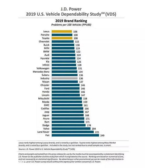 据美国权威市场调查公司J.D. Power公布的2019年汽车可靠性研究报告来看,丰田第二,路虎倒数第二。 J.D. Power建立于1968年,一直以来以其调研的严谨性和权威性著称。特别是在汽车质量评价相关的调研报告在行业内公认是最值得信赖的公司。J.D. Power公司在汽车行业的调研报告很多,涵盖了从新车销售到使用一定年限后的满意度。 来源:车e估
