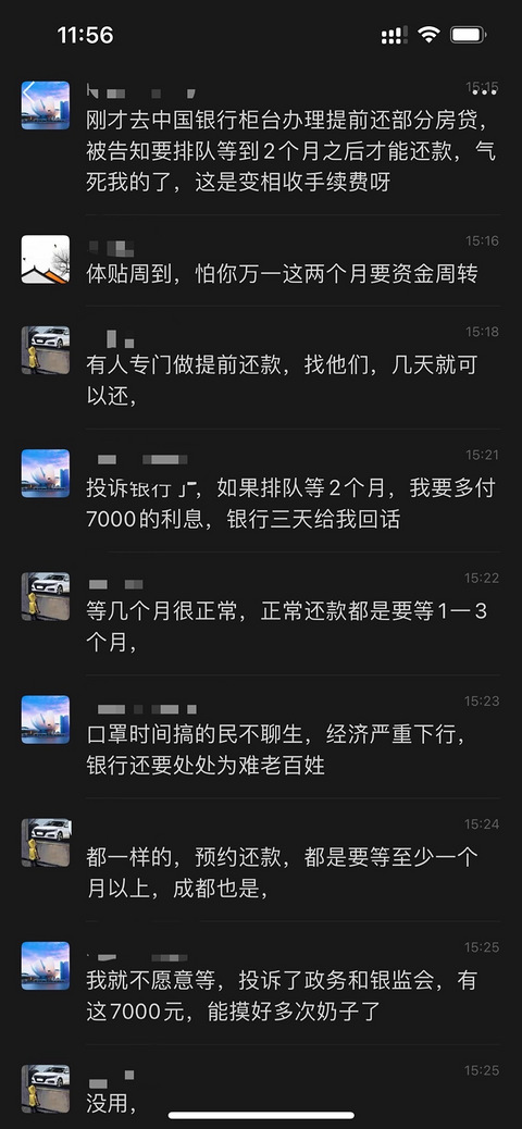 我今天联系了贷款的沙坪坝JS银行,预约提前还款。告知需要排队,之前贷款的时候说的是借款满一年就可以提前还款,现在确实要等银行安排,我也是醉了。然后搜索了一下朋友圈,发现都不是个例!