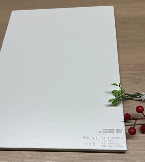 爱格w980铂金白 环保等级F4 星超美的白色系花色,还带有暖黄色调哦。它的表面是麻面肌理,有着柔焦天鹅绒面的效果,质感那叫一个柔和 这个花色超级百搭,能用于好多风格的家居设计,奶油风和简约风尤其适配。既可以当主色,也能做配色,和其他纯色、木纹色搭配都超棒,基本不会出错